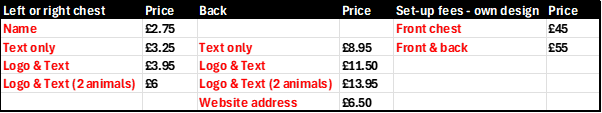 All work is done in house, with a quick and professional service. Simply choose your clothing, let us have your details and we will do the rest.