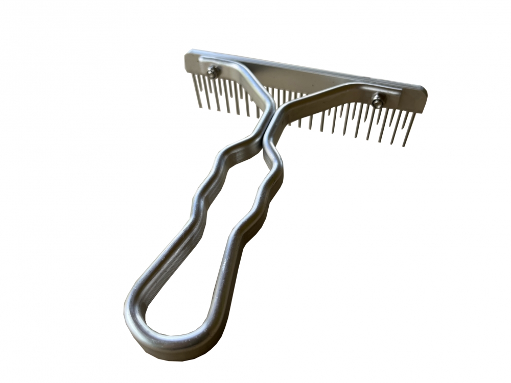 A new range of livestock grooming combs, made of quality Aluminium. A light, yet strong comb, that is specially designed to give the hair coat more body, fullness, and a more professionally groomed appearance. The regular comb is great for everyday hair care while the fluffer has longer needles to reach the hair close to the body and fluff them up instead of pulling them out. The shorter needles give the hair coat a smoother, more managed, finished look. Excellent for use with a blower.