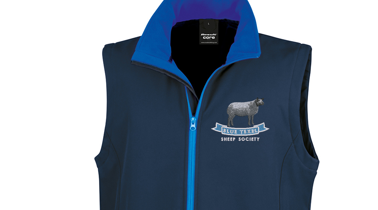 Gilets are embroidered with the Blue Texel Sheep Society logo on the front left chest, flock names can be added to this item above the logo in capitals.