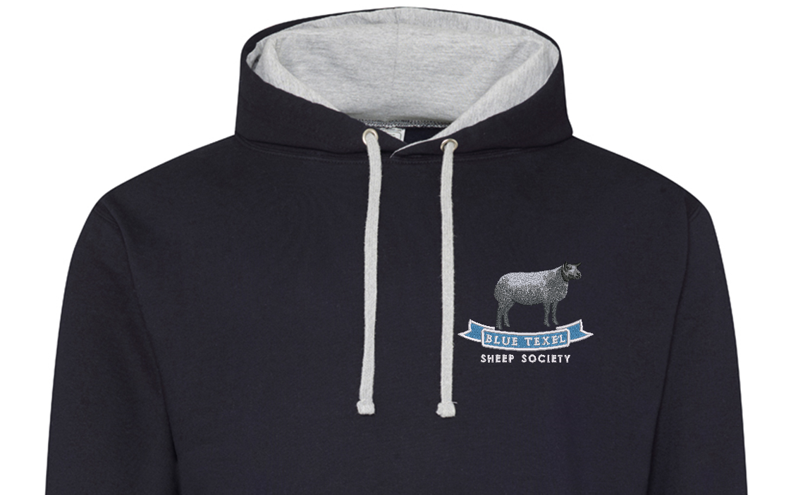 Hoodies are embroidered with the Blue Texel Sheep Society logo on the front left chest, flock names can be added to this item above the logo in capitals.