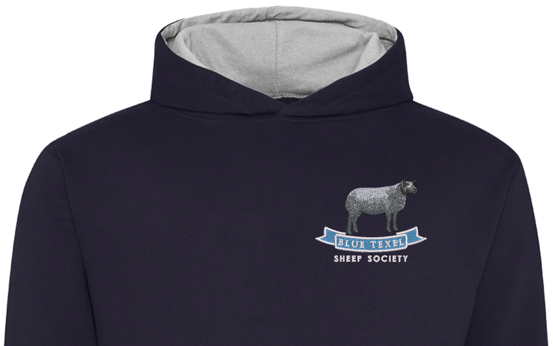 Hoodies are embroidered with the Blue Texel Sheep Society logo on the front left chest, flock names can be added to this item above the logo in capitals.