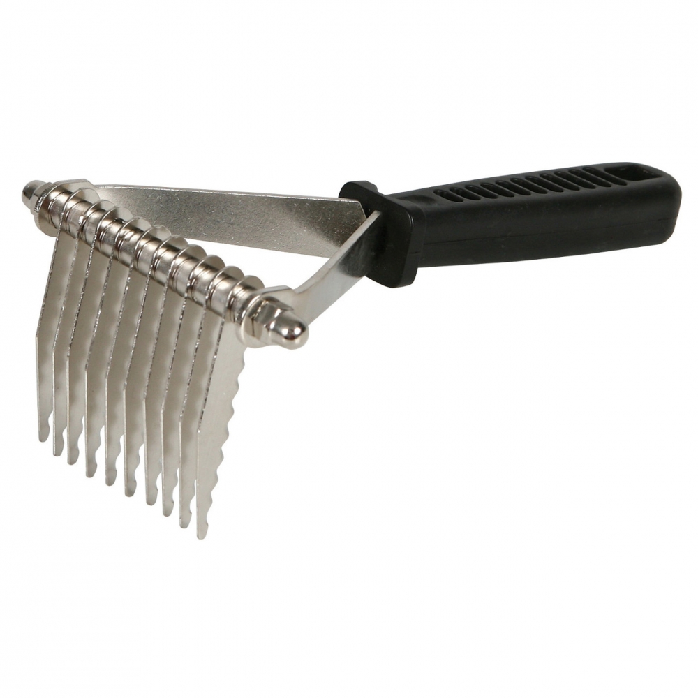Combs and cuts at the same time, making it extremely useful for cleaning up hair on all types of animals. Removes knots, tangles, mats and burrs from Highland and other long haired cattle.